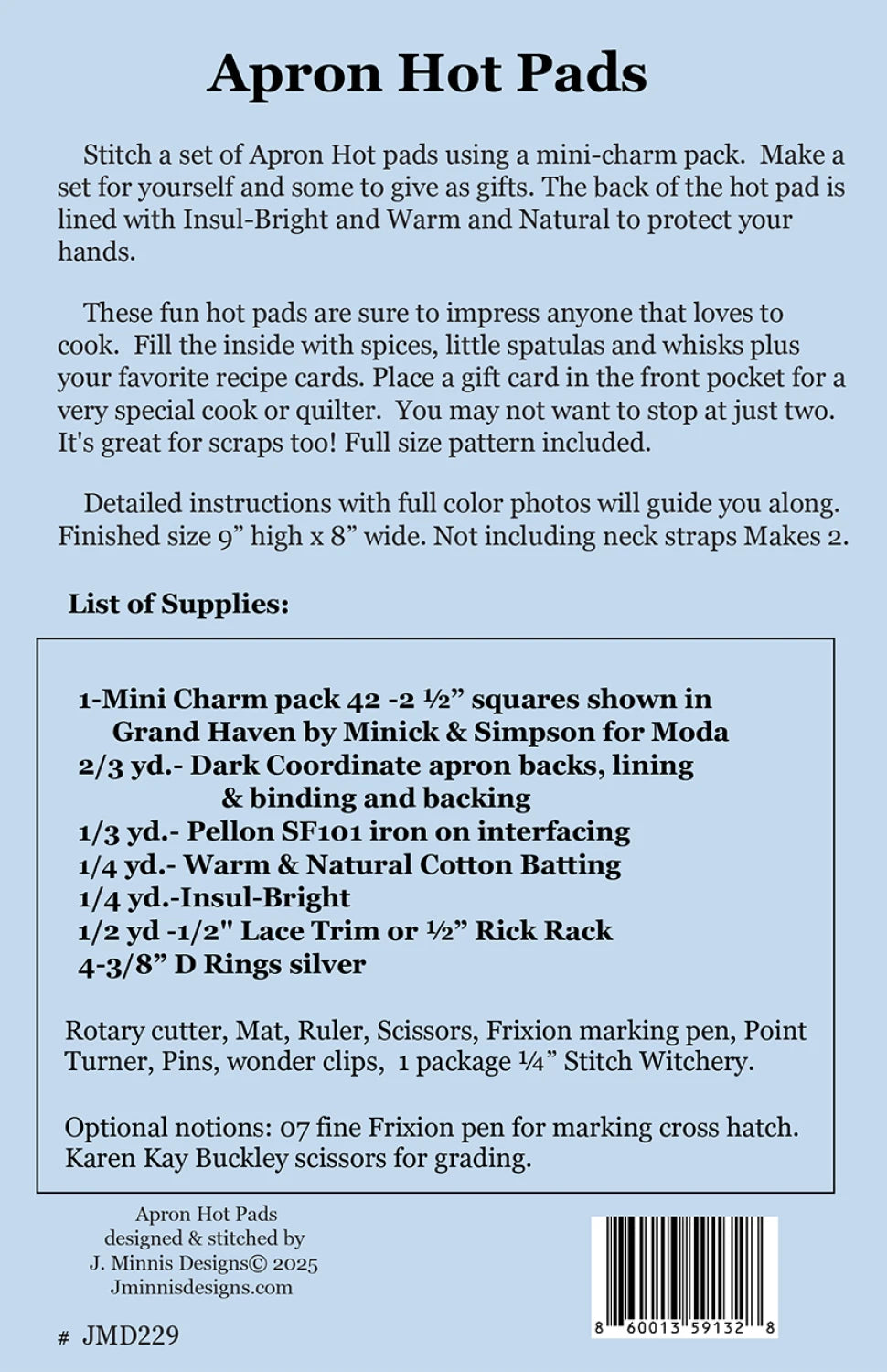 This is such a lovely hot pad pattern! Your kitchen will love it! In fact, this pattern was featured in Quilting Digest. Stitch a set of Apron Hot pads using a mini-charm pack. Make a set for yourself and some to give as gifts. The back of the hot pad is lined with Insul-Bright and Warm and Natural to protect your hands. These fun hot pads are sure to impress anyone that loves to cook. Fill the inside with spices, little spatulas and whisks plus your favorite recipe cards. Place a gift card in the front pocket for a very special cook or quilter. You may not want to stop at just two. It's great for scraps too! Full size pattern included. Fabric shown in the sample hot pads is Moda Fabrics Moda Mini-Charms.