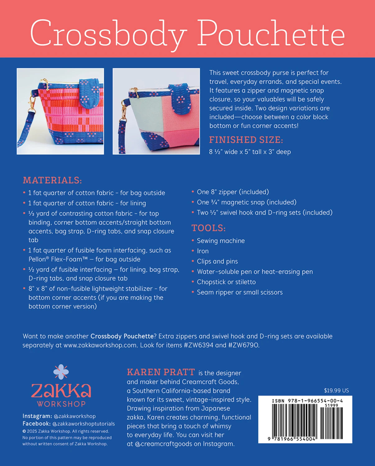 This sweet crossbody purse is perfect for travel, everyday errands, and special events. It features a zipper and magnetic snap closure, so your valuables will be safely secured inside. Two design variations are included—choose between a color block bottom or fun corner accents! Includes instructions, full-size pattern sheet, one 8" metal droplet pull zipper, two rose gold 1/2" swivel hooks and D-rings, and one rose gold magnetic snap. Finished Size: 8 1/2" wide x 5" tall x 3" deep
