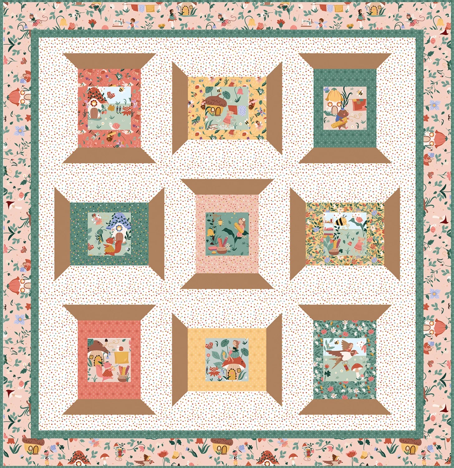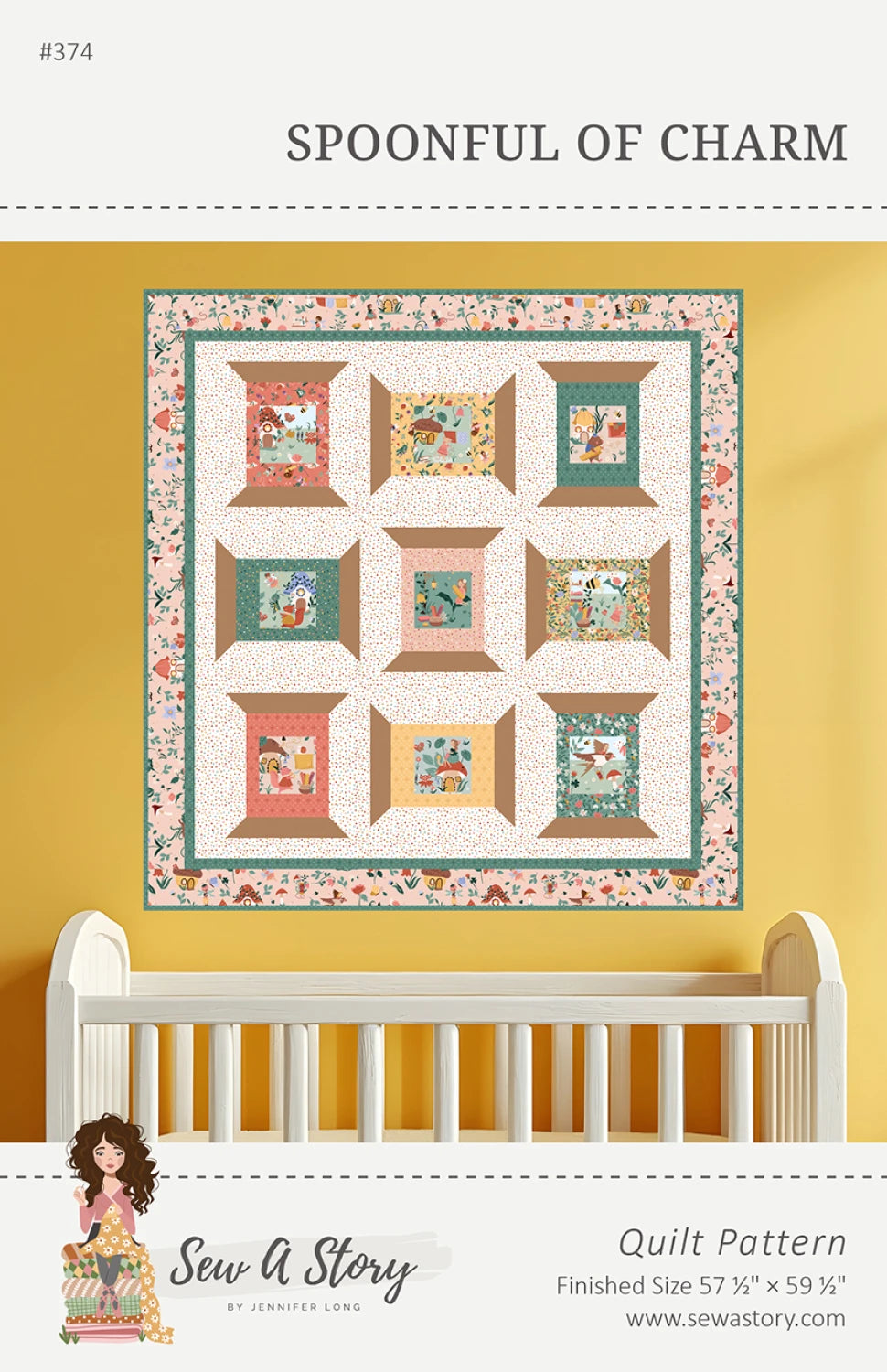 "The Spoolful of Charm Quilt combines the Thimbelina Storybook Panel for fun fussy cutting with a mix of delightful fabrics from the Thimbelina collection, including sewing fairies, dotted prints, and garden motifs. This confident-beginner quilt is simple yet captivating, making it an enjoyable project for anyone who loves storytelling through fabric. The finished quilt measures 57½"" x 59½"", perfect for brightening up your sewing space or gifting to a fellow maker. Quilt Along: Join the Spoolful of Charm Quilt Along starting January 7, 2026, and create your own whimsical masterpiece alongside a vibrant sewing community. Learn more on the Sew A Story Blog."