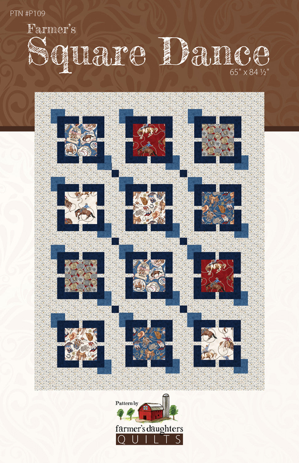Quilters of all skill levels will enjoy this quick and easy pattern. Farmer’s Square Dance is an easy pattern to kit, using either 12 – 10” squares, 6 Fat Sixths or 1 Yard of a focal print. We love how the quilt showcases focal prints! The pattern is printed in full color with easy-to-follow instructions and graphics. The finished size is 65” x 84.5”.