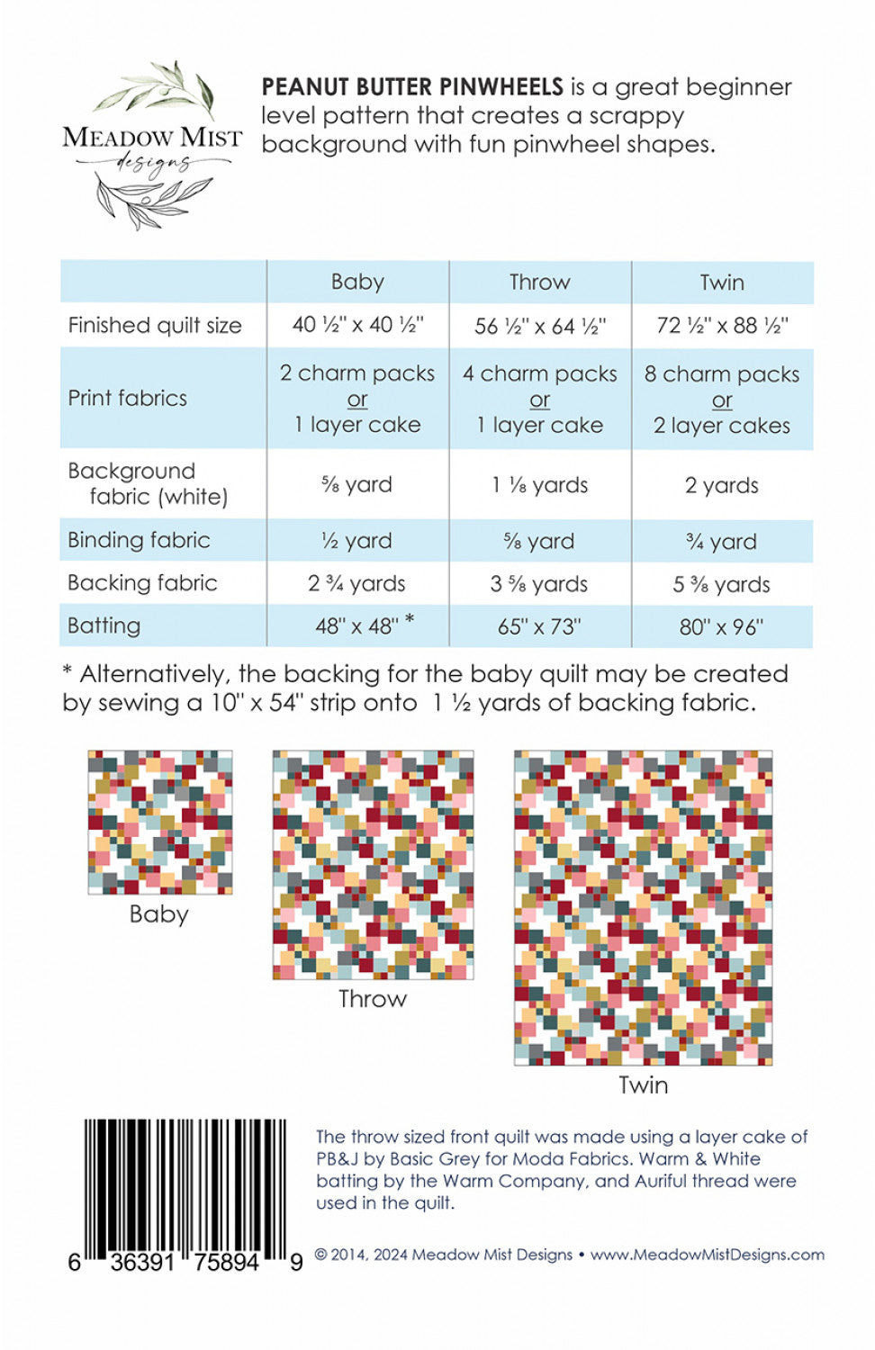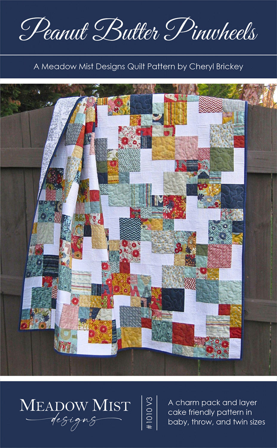 Peanut Butter Pinwheels is a fun and easy charm pack and layer cake friendly pattern. When the quilt top is sewn together a secondary design of pinwheels appears. The quilt pattern includes instructions for baby, lap, and twin sizes.